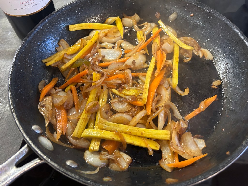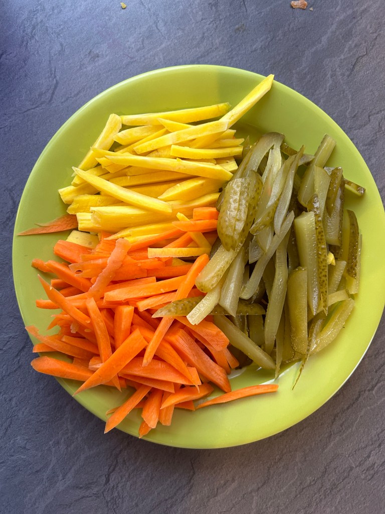 A marhaszeleteket kiklopfoljuk, megkenjük vékonyan mustárral, ráterítjük a vékonyra szeletelt bacont. Èn füstölt mangalica szalonnát használtam. A zöldségeket megpucoljuk, égy gyufaszál vékonyra felszeleteljük, az uborkát is.