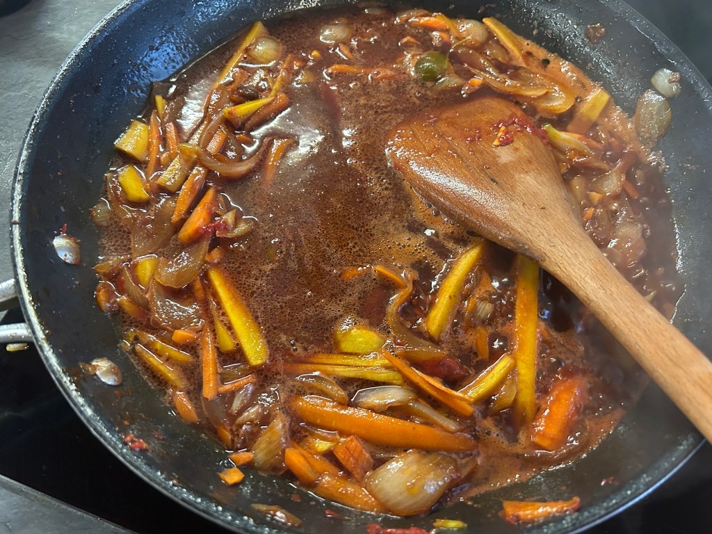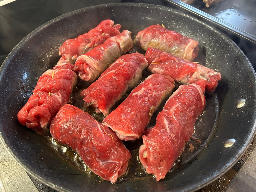 A zöldségekböl teszünk a húsra 4-5 szál répát, 2 uborkát, és felgöngyöljük. Fogvájóval összetüzzük. A roládokat forró zsiradékon, egy serpenyöben lepirítjuk. Àtszedjük egy mélyebb tepsibe, vagy jénaiba. A hagymát szeletekre vágjuk, és a serpenyöbe lepirítjuk, hozzáadjuk a megmaradt zöldségeket, mert fog megmaradni. Hozzáadjuk a paradicsompasztát, a barnacukrot, elkeverjük, hagyjuk kicsit karamellizálódni, majd felöntjük a vörösborral. Hozzáadjuk a babérlevelet, a szemes borsot, és összeforraljuk. Ráöntjük majd a roládokra, felöntjük alaplével, én húslevest adtam hozzá, és sütöbe tesszük, lefödve, vagy ha mélyebb tepsibe tesszük , akkor alufóliával takarjuk le. Ìgy pároljuk 180 C°-on, legalább 60 percig, ellenörizzük, hogy mennyire puha,-ez függ a hústól, és ha szükséges akkor még tovább pároljuk. A roládokat kiszedjük egy lábosba, a levét pedig átszürjük egy másik lábosba. Az étkezésikeményítöt elkeverjük 4 evökanál vizzel, hozzáadjuk az átszürt alaphoz, lassan kevergetve besürüsítjük. Sózzuk, borsozzuk, ha szükséges. A zöldségeket félretesszük, azt majd tálalhatjuk a hússal. Széllesmetéltet (Pappardelle-t) föztem mellé.