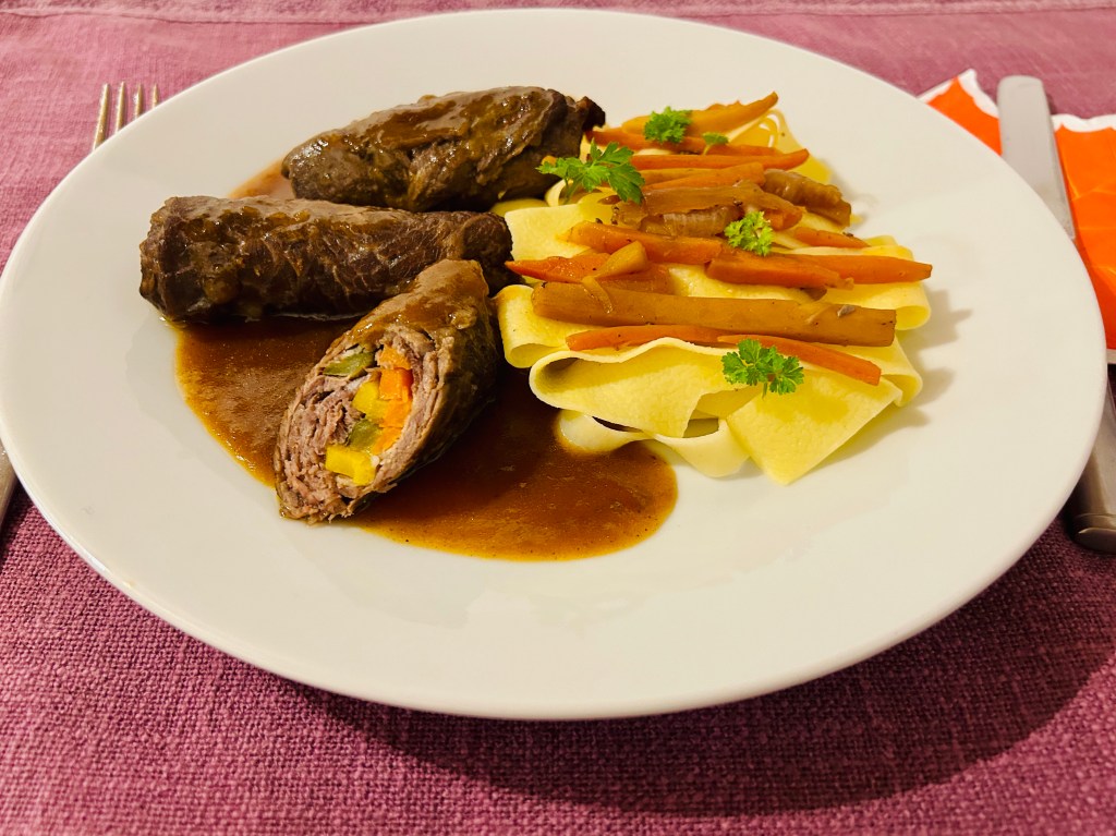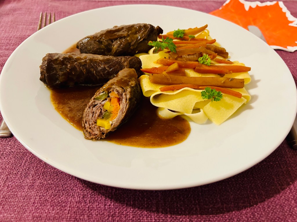 A marharolád “Rinderrouladen” osztrák/ német konyha egyik klasszikusa. Sok mindent bele lehet göngyölni, àltalában, gyökérzöldségeket, ecetes uborkát szoktak. Barna mártással és zsemle gombóccal szokták kínálni, de kifött tésztával vagy krumplipürével sem rosz. Ìzletes vasárnapi, ünnepi ebéd.