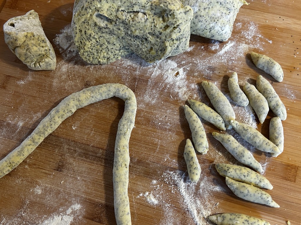 A másik köret, a mákos nudli. Ne a desszertre gondoljunk. Krumplis tésztából készült nudli, melybe 2-3 evökanál szemes mákot gyúrtam.