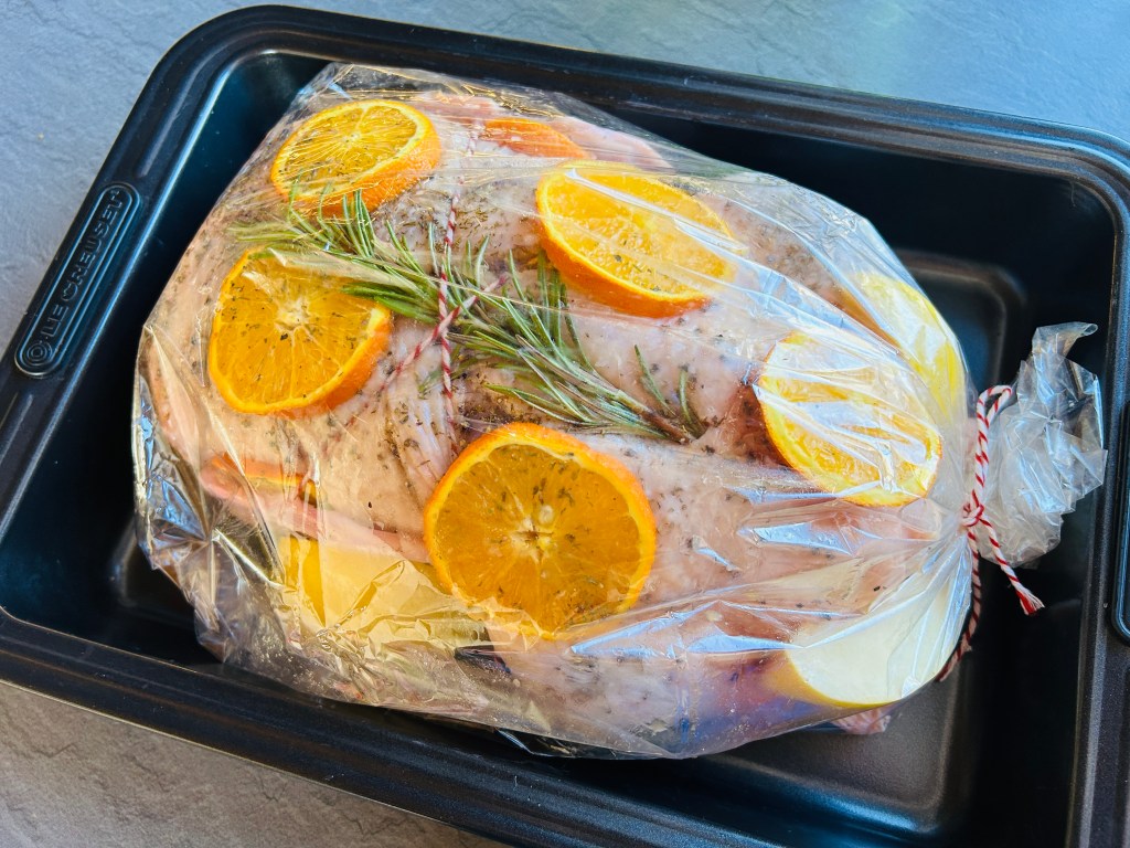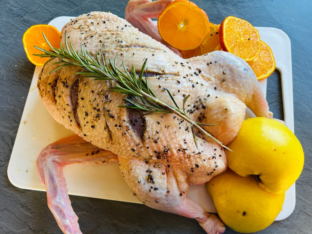 Egy szál rozmaringot a mellére, melyet rögzítünk egy húskötözö zsineggel, így a szárnyait is összekötjük. A harmadik narancsot is fölszeleteljük, körbe rakjuk vele a kacsát, ha minden nem fér a hasüregbe, rakjuk mellé a zacskóba.