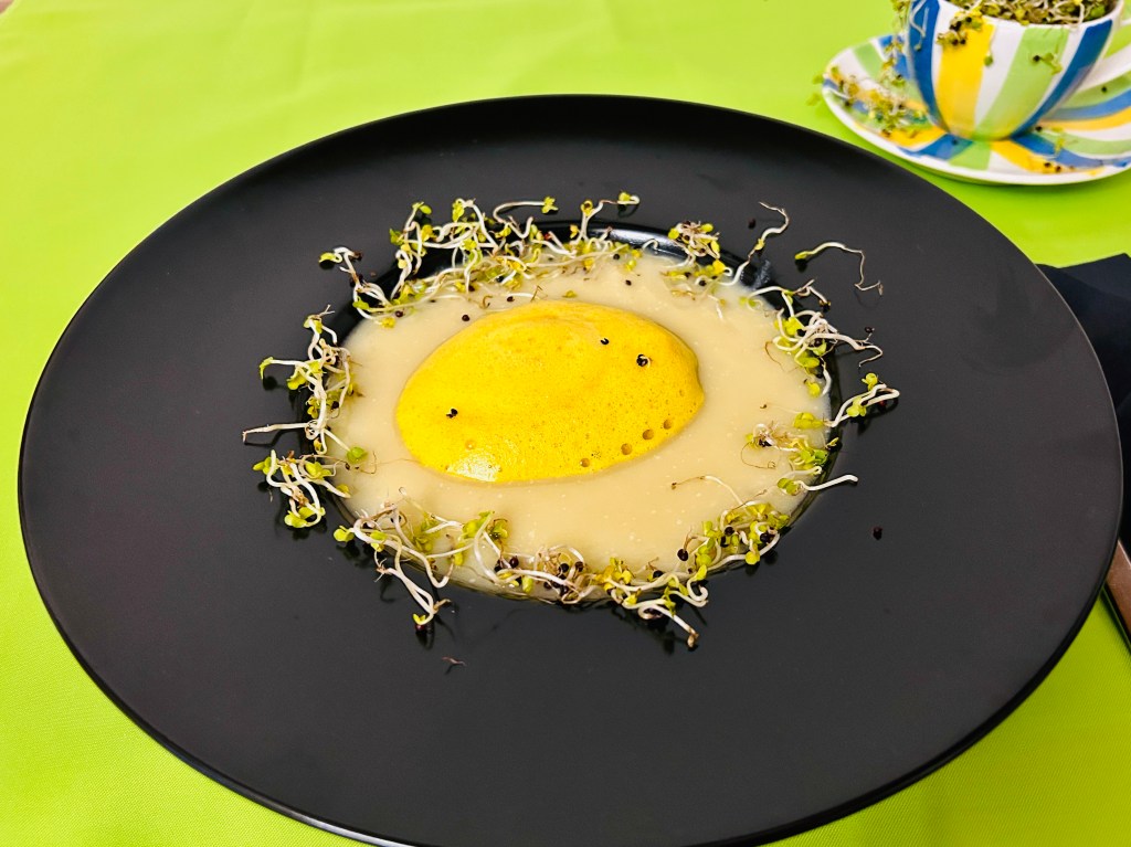Ezt akár tovább is fokozhatjuk a kurkumás tejhabbal, és a tavasz szimbólumaként a brokkoli vagy valamilyen csírával.