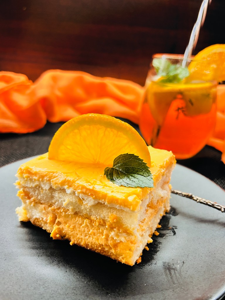 A narancsszeletek és egy kis reszelt narancshéj a tetején olyan vibráló szín- és ízkombinációt hoznak létre, savanykás-kesernyés, és nem túl édes, amely tökéletesen illik egy napsütötte nyári délutánhoz vagy estéhez.