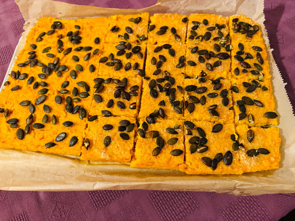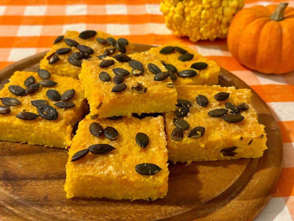 Egy tepsit kibélelünk sütöpapírral, beleöntjük a polentát, a tetjét meghintjük parmezánnal, és tökmaggal. Kicsit belenyomkodjuk a tökmagokat. Elömelegített sütöben 180 C°-on sütjük 15 percig, majd felsö sütéssel kicsit még rápirítunk, kb. 10 percet.