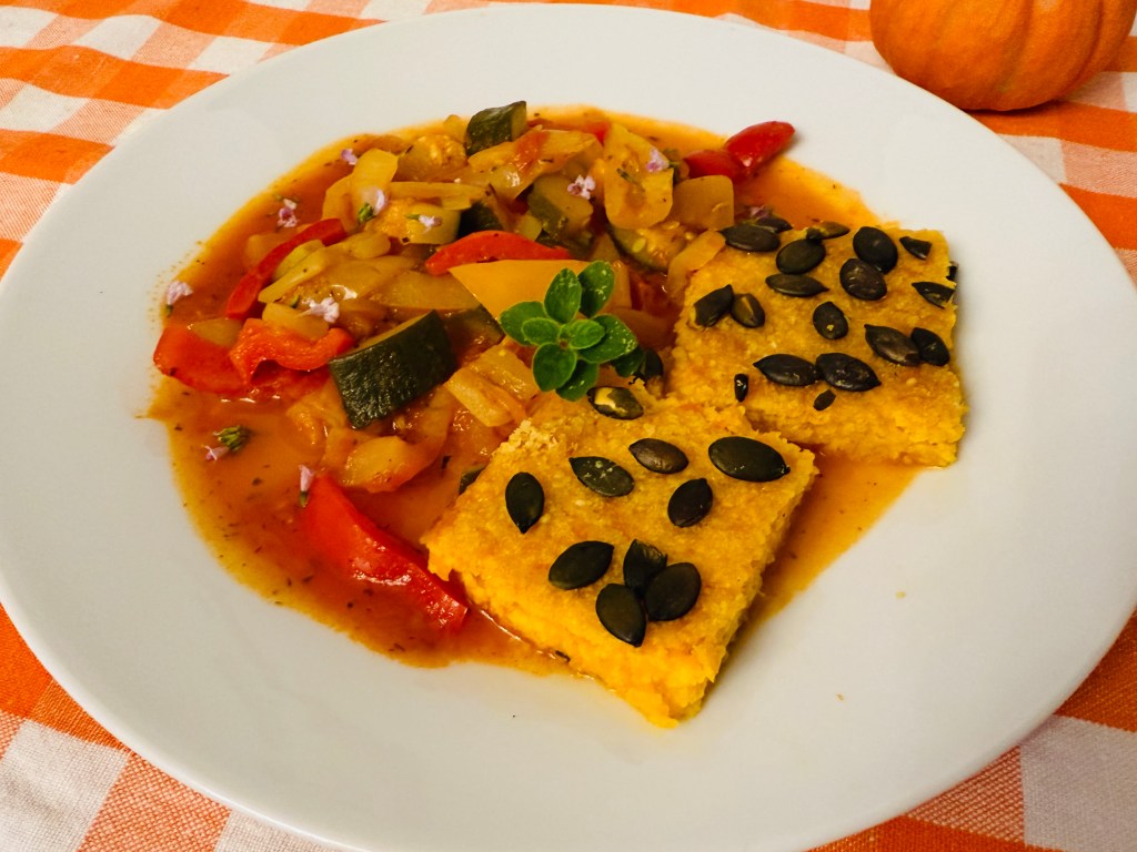 Egy mediterrán jellegü lecsó mellé tálaltam, melyben volt paradicsom hagyma, paprika, cukkini, oregánóval, kakukkfüvel ízesítettem. Ez egy vega változat, de szaftos húsok mellé is tudom ajánlani.