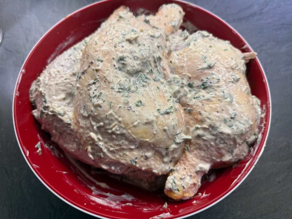 Egy tálban keverjük össze a joghurtot, az egyik citrom reszelt héjat és levét, a zúzott fokhagymát, 3 evőkanál olívaolajat, oregánót, kakukkfüvet, apróra vágott petrezselyemzöldet, sót és borsot ízlés szerint. A csirke darabokat forgassuk bele a pácba, feddjük le, és tegyük hűtőbe legalább 2 órára, de ha tehetjük akár egy egész éjszakára.
