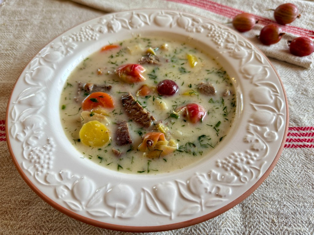 A gazdag húsleves alapot a tejszínes habarás lágyítja, az egres savanyúsága pedig frissességet ad neki – így lesz belőle egyszerre rusztikus és kifinomult, ismerős és szokatlan.