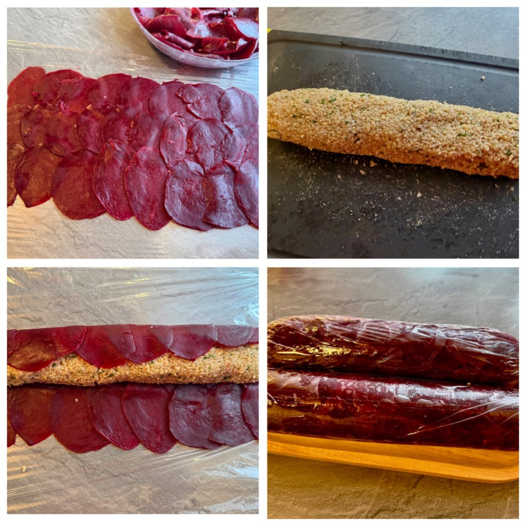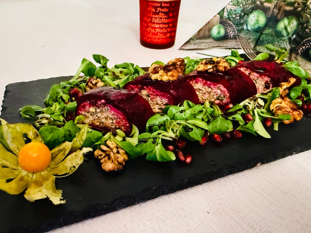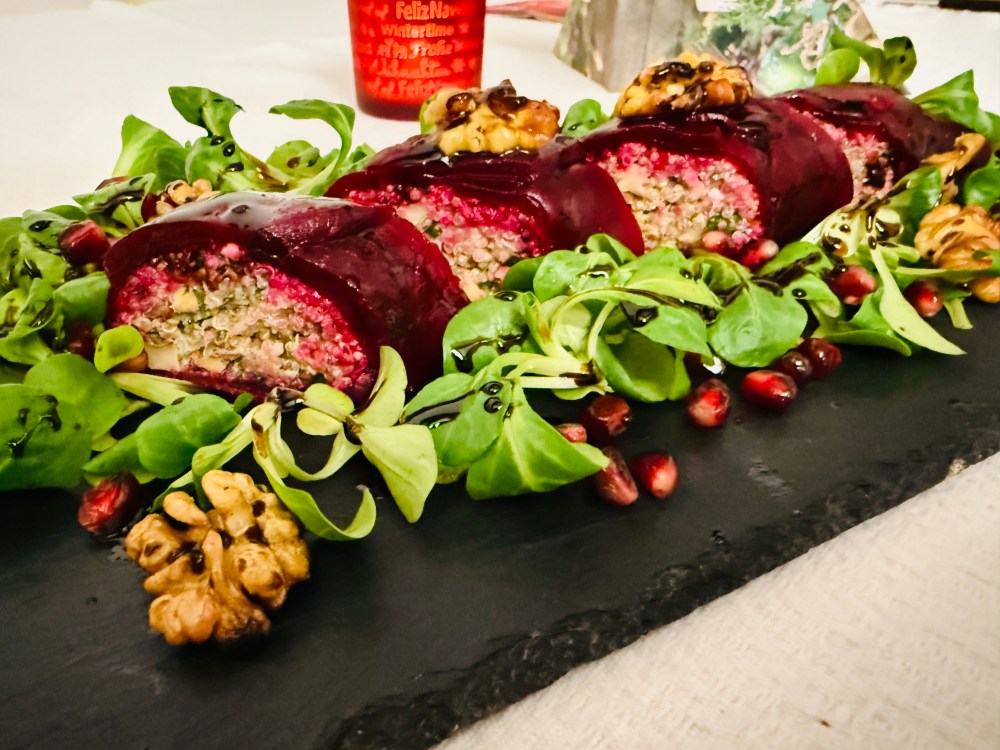 Egy vegán ünnepi előétel, amelyet akár egy nappal előre is elkészíthetünk, így karácsonykor már nem a konyhában kell kapkodnunk. Ez a quinoás céklarolád pontosan ilyen: nyugodt, átgondolt fogás, amely időt kér – de cserébe bőven visszaadja azt. A vékonyra szeletelt, földesen édes cékla szorosan körbefogja a dióval és friss petrezselyemmel gazdagított quinoát, amelyet a lenmag természetes módon fog össze. Teljesen növényi alapú, mégis stabil, szeletelhető, hidegen is tökéletes állagú étel, amely egy éjszakányi pihenés után mutatja meg igazán magát.