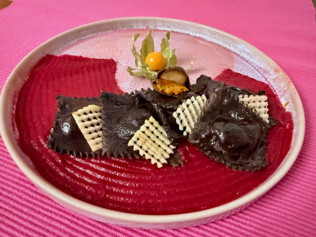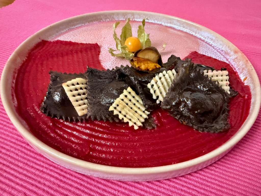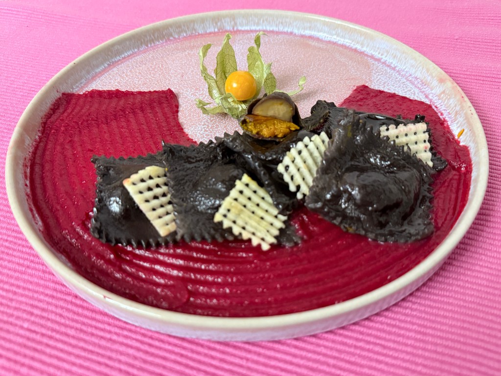 A ravioli fekete kakaóval, és kávéval van színezve, ízesítve.